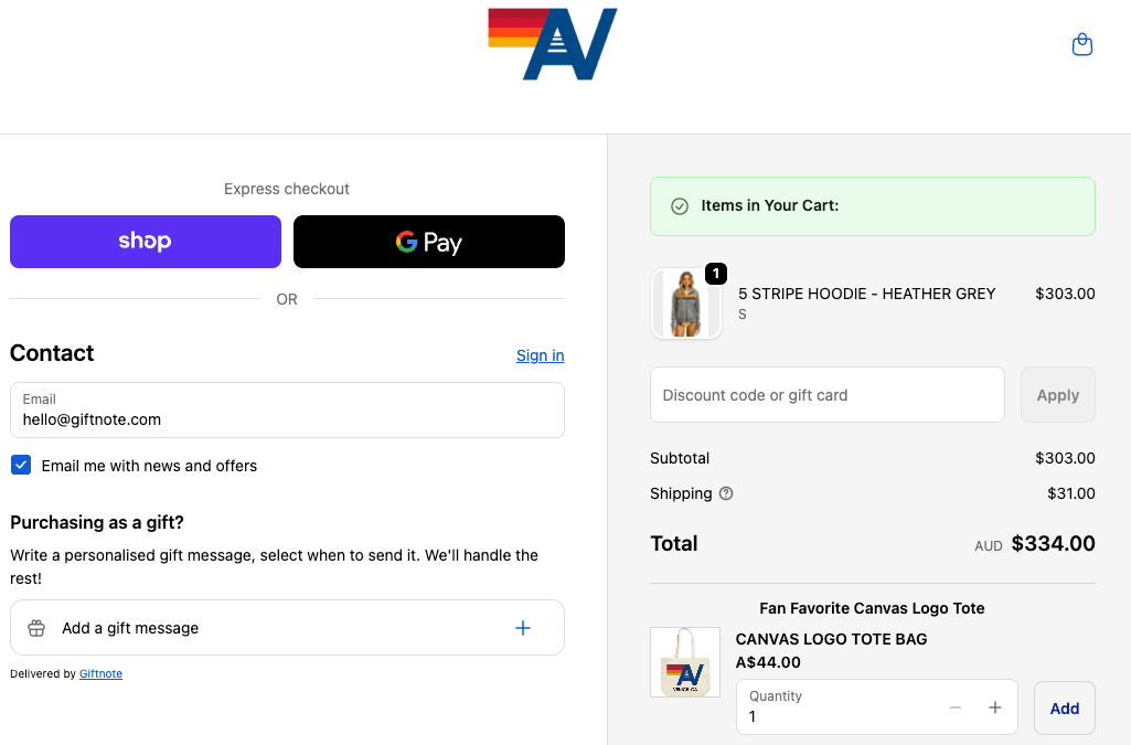 See Giftnote in action for Aviator Nation (add item to cart and click checkout)