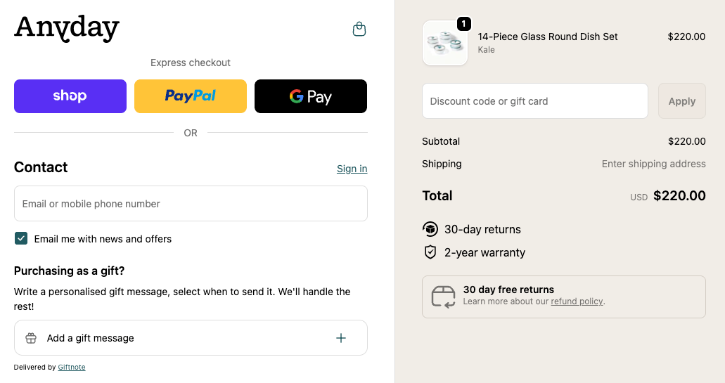See Giftnote in action for Anyday Cookware (add item to cart and click checkout)